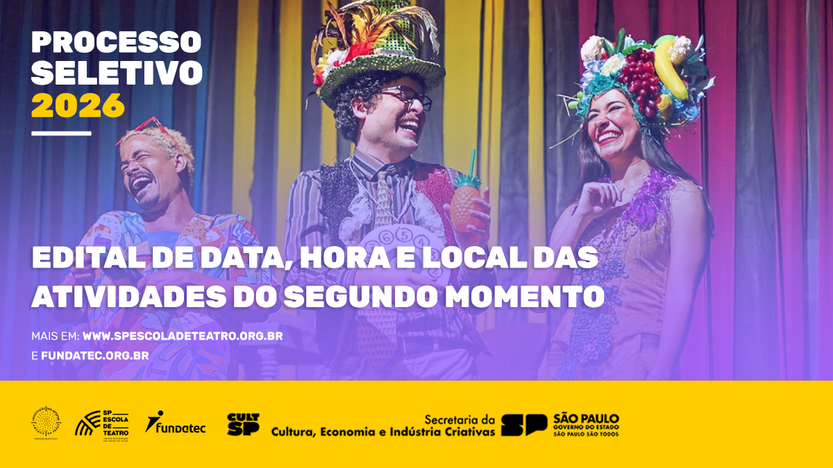 Conforme previsto no edital de abertura do Processo Seletivo 2026/1º semestre, publicado no site da SP Escola de Teatro – Centro de Formação das Artes do Palco, a Instituição divulga hoje (5) a lista de convocados para as atividades de Segundo Momento, referente ao Processo Seletivo para as turmas do 1º semestre de 2026.