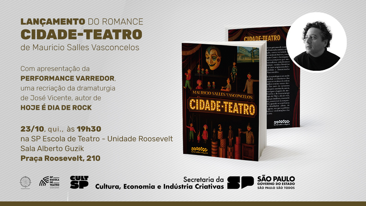 Acontece nessa quarta-feira (23) na unidade Roosevelt da SP Escola de Teatro – Centro de Formação das Artes do Palco o lançamento do livro “Cidade-Teatro”, de Mauricio Salles Vasconcelos.