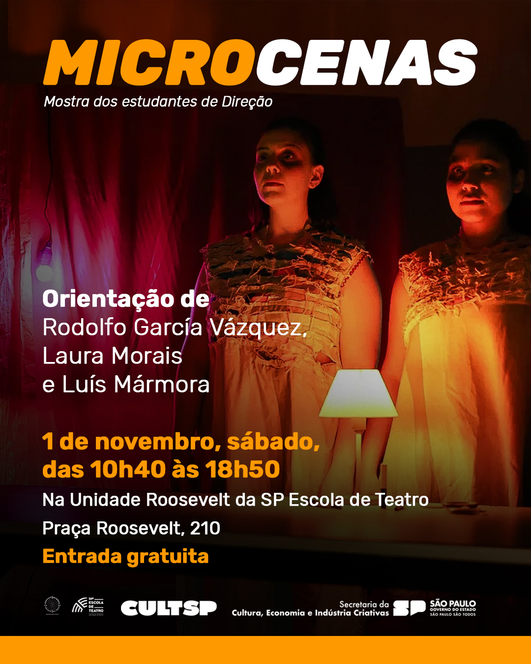 Acontece neste sábado (1º de novembro) na unidade Roosevelt da SP Escola de Teatro – Centro de Formação das Artes do Palco, das 10h40 às 18h50, o segundo dia da Mostra de Microcenas do segundo semestre de 2025.