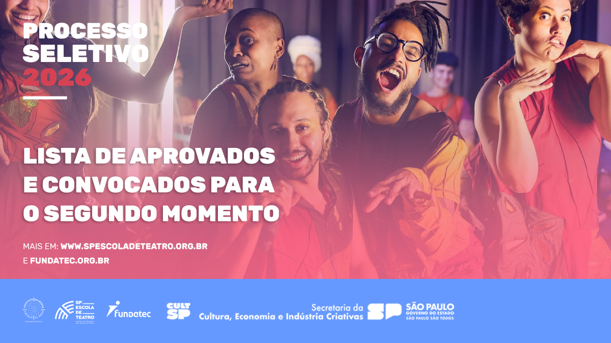 Conforme previsto no edital de abertura do Processo Seletivo 2026/1º semestre, publicado no site da SP Escola de Teatro – Centro de Formação das Artes do Palco, a Instituição divulga hoje (5) a lista de convocados para as atividades de Segundo Momento, referente ao Processo Seletivo para as turmas do 1º semestre de 2026.