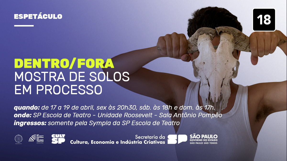 Acontece de 17 a 19 de abril na SP Escola de Teatro – Centro de Formação das Artes do Palco a mostra de solos “Dentro/Fora”, com oito espetáculos de média duração.
