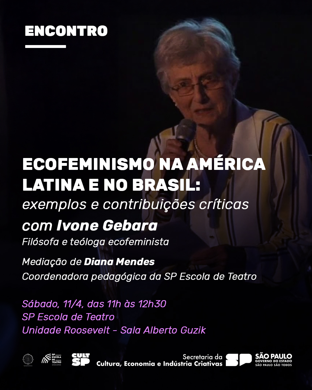 Nesse sábado (11), os estudantes matriculados nos Cursos Regulares da SP Escola de Teatro – Centro de Formação das Artes do Palco conversam com Ivone Gebara, filósofa e teóloga ecofeminista.