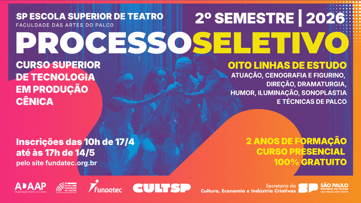 SP Escola Superior de Teatro – Faculdade das Artes do Palco, instituição da Secretaria da Cultura, Economia e Indústria Criativas do Estado de São Paulo gerida pela ADAAP, abre às 10h de 17/4 as inscrições para o seu Processo Seletivo 2026/2, para o Curso Superior de Tecnologia em Produção Cênica, referente às novas turmas que iniciam no segundo semestre de 2026, a partir de agosto.